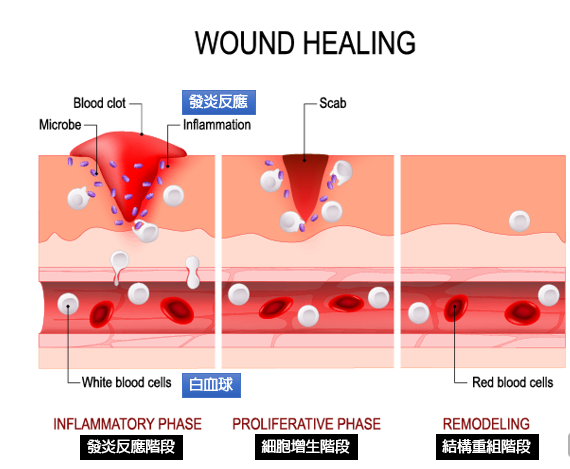 藍銅胜肽在皮膚修復中的角色 傷口癒合和皮膚修復的過程,包含了發炎反應、細胞增殖、細胞遷移以及真皮基質的重塑。過度的發炎可能會延緩癒合並且導致疤痕的形成。